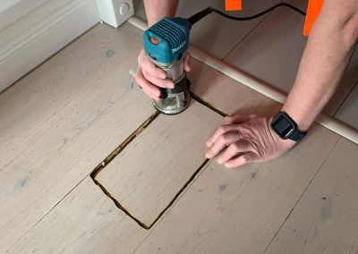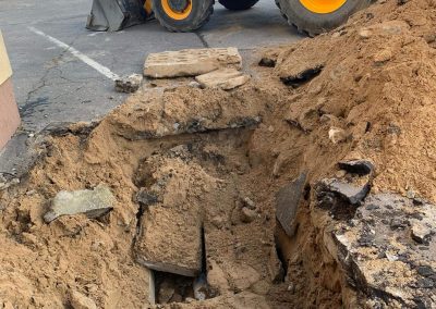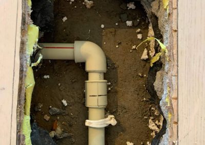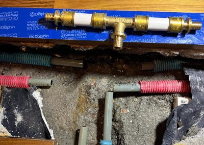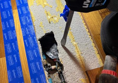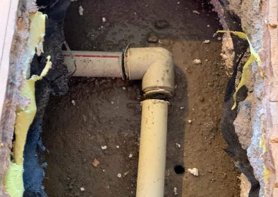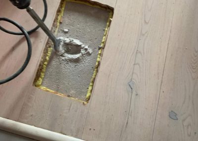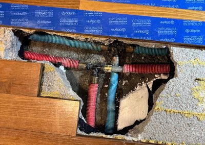 Przystąpiono do wycięcia otworu w panelu podłogowym, wykucia wylewki betonowej, wycięcia pękniętego kolana 90 stopni na instalacji. Następnie dokonano naprawy.