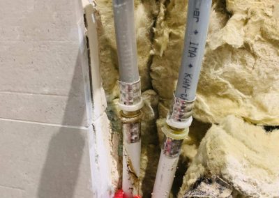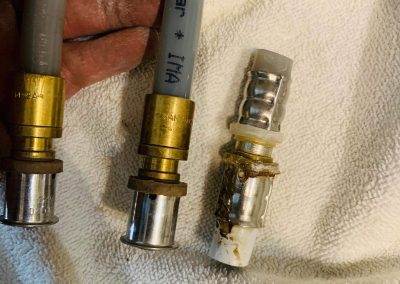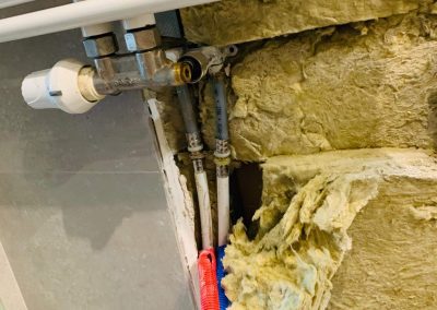 Po przybyciu przeprowadzono wszystkie niezbędne badania w celu zlokalizowania miejsca nieszczelności. Przystąpiono do zdemontowania grzejnika ściennego w łazience, następnie wycięto kafle, które nadawały się do ponownego montażu po naprawie hydraulicznej. Przyczyną był błąd w sztuce wykonawczej – zastosowano złączkę od innego systemu niż instalacja znajdująca się w ścianie. Dokonano naprawy.
